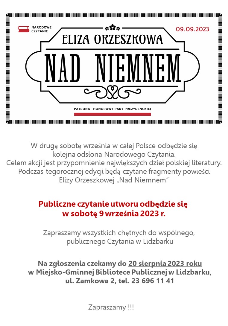 Zapraszamy wszystkie chętne osoby do aktywnego udział w Narodowym Czytaniu. W tym roku wydarzenie odbędzie się 9 września i będziemy czytać fragmenty powieści Elizy Orzeszkowej „Nad Niemnem”. Na zgłoszenia osób zainteresowanych publicznym przeczytaniem fragmentu powieści czekamy do 20 sierpnia 2023 roku w Miejsko-Gminnej Bibliotece Publicznej lub telefonicznie 23 696 11 41. Każdy aktywny uczestnik wydarzenia otrzyma pamiątkowy certyfikat. Zachęcamy i zapraszamy do udziału.