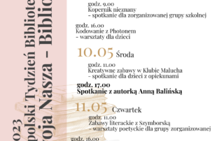 W poniedziałek, 8 maja rozpoczynamy Tydzień Bibliotek. Przypomnijmy, Tydzień Bibliotek to ogólnopolska akcja, której inicjatorem jest Stowarzyszenie Bibliotekarzy Polskich. W tym roku jest to już 20. edycja, a hasło tegorocznego wydarzenia "Moja Twoja