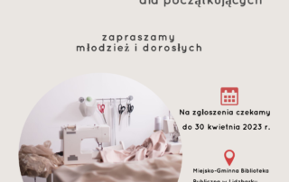 Zapraszamy młodzież i dorosłych na kolejną edycję kursu szycia na maszynie. Warsztaty są bezpłatne, na zgłoszenia czekamy do 30 kwietnia 2023 roku. Miejsko-Gminna Biblioteka Publiczna w Lidzbarku, tel. 23 696 11 41. Zapraszamy