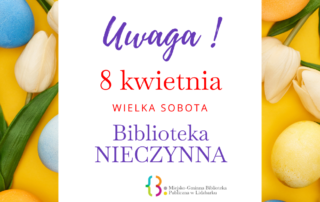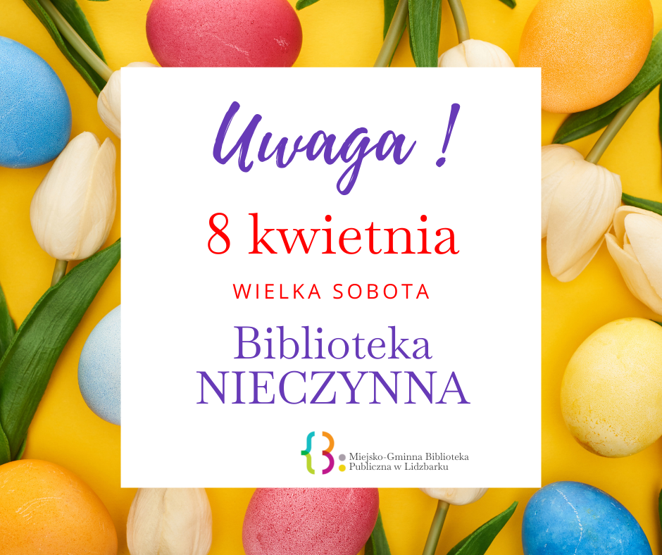 Uwaga! W sobotę, 8 kwietnia Biblioteka będzie nieczynna. Za utrudnienia przepraszamy.