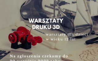 Zapraszamy dzieci w wieku 12 lat na warsztaty tworzenia druku 3D. W trakcie warsztatów dzieci samodzielnie zaprojektują modele 3D, które będą drukowane na drukarce 3D. Warsztaty tego typu rozwijają wyobraźnie przestrzenną i pozwalają